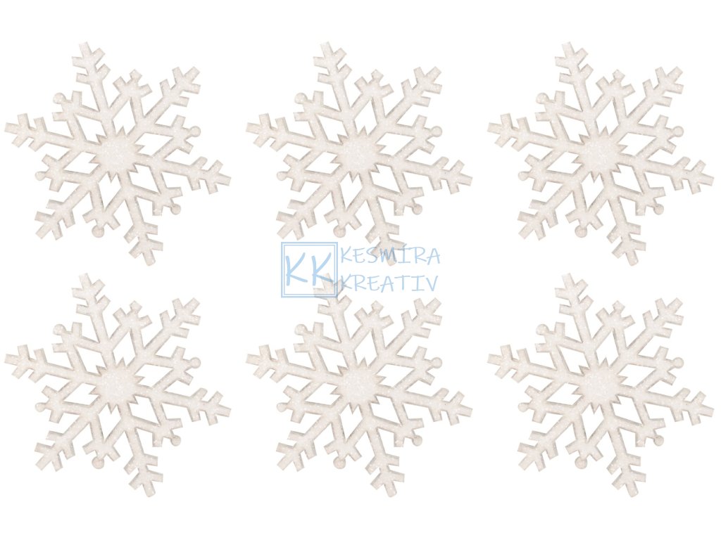 Sada obsahuje 6 dřevěných výřezů ve tvaru vločky o průměru cca 6 cm, s lesklým glitrovým povrchem pro elegantní a slavnostní vzhled. Tyto vločky jsou ideální pro vánoční výzdobu, zimní dekorace, dárkové balení nebo kreativní DIY projekty — dodají dekoracím jiskru a eleganci.
