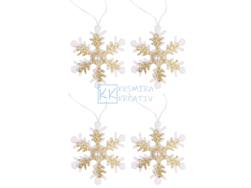 Glitrové dřevěné vločky na zavěšení 6 cm, balení 4 ks — dostupné ve variantě bílostříbrná nebo bílozlatá, ideální pro zimní dekorace, věnce či větvičky.