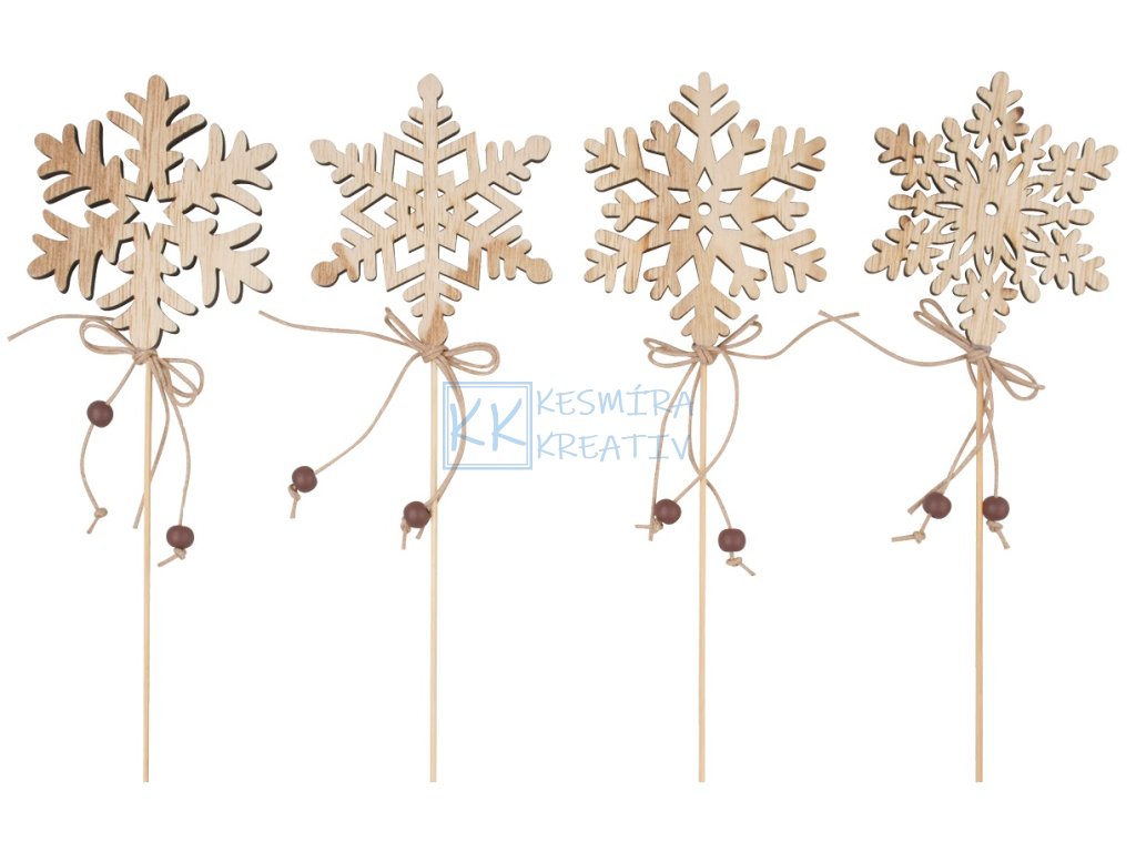 Tato dřevěná vločka o průměru cca 8 cm je osázená korálky a připevněná na špejli — skvělé jako zajímavý doplněk do zimních a vánočních aranžmá. Hodí se pro věnce, květinové vazby, girlandy, dárkové aranžmá nebo jako netradiční dekorační prvek v interiéru.